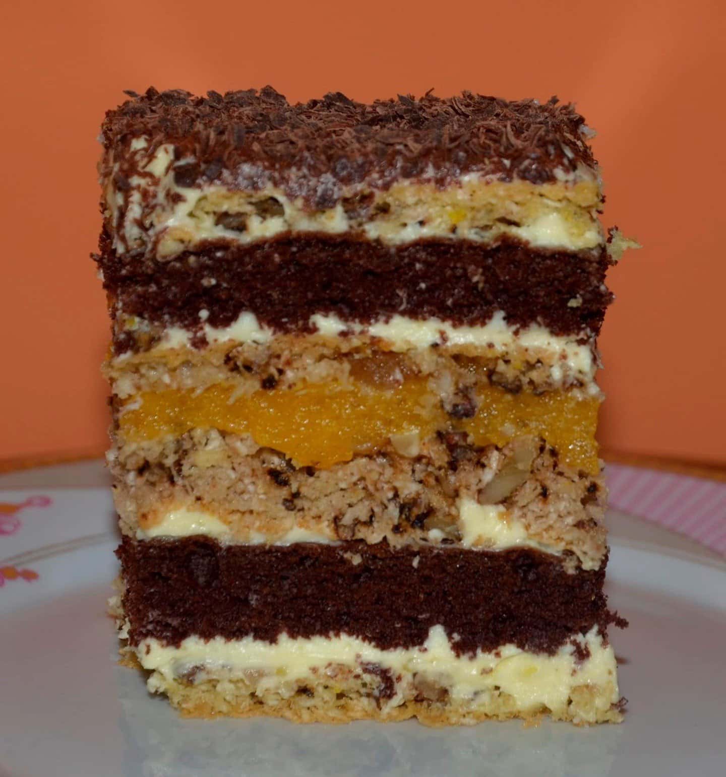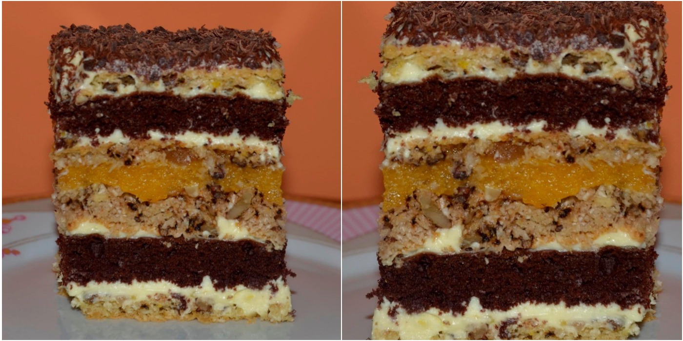 На підложку викладаємо горіхово-кокосову паляницю, змастити кремом, шоколадна паляниця, крем, горіхово-кокосові паляниці з персиковою прослойкою, крем, шоколадна паляниця, крем, горіхово-кокосова паляниця.