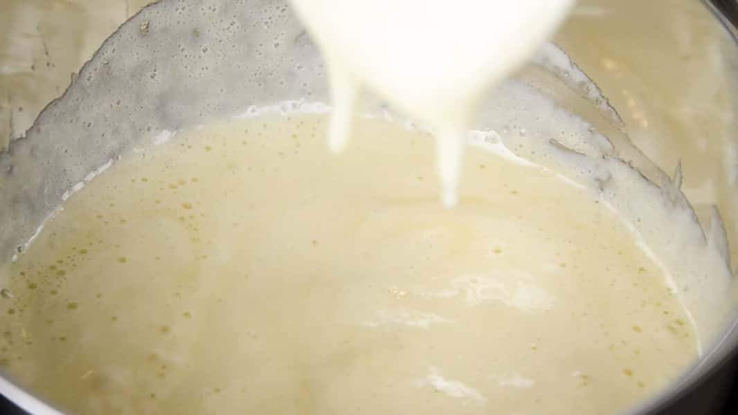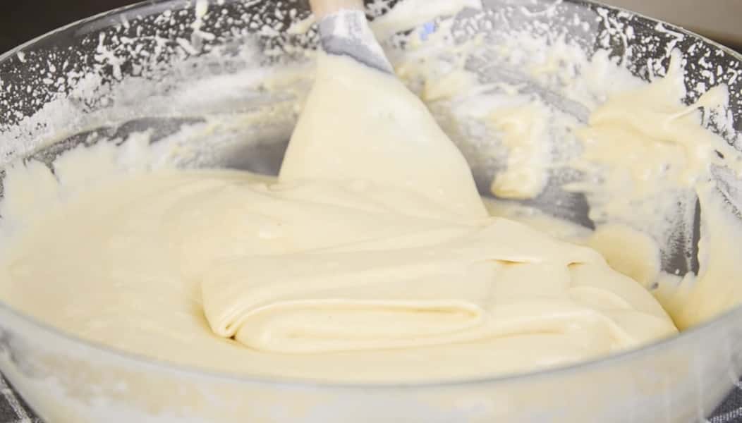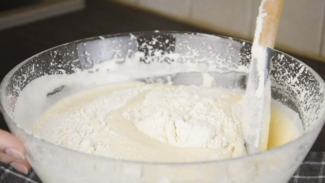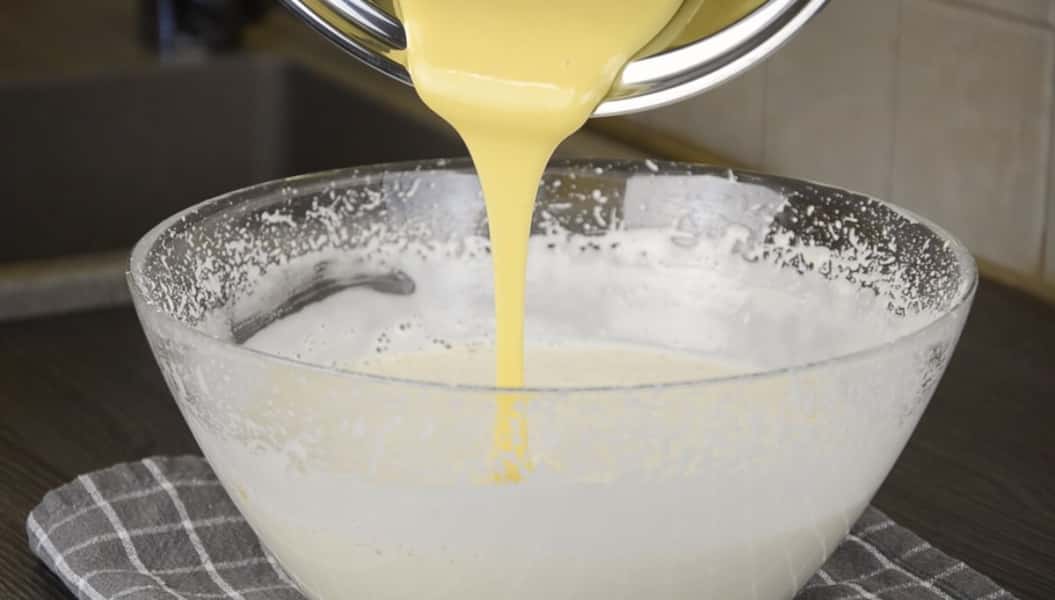 Тісто по густоті має вийти повітряним. За кольором воно нагадує звичайнісінький бісквіт, але після випікання у нього з’явиться гарний карамельний відтінок.