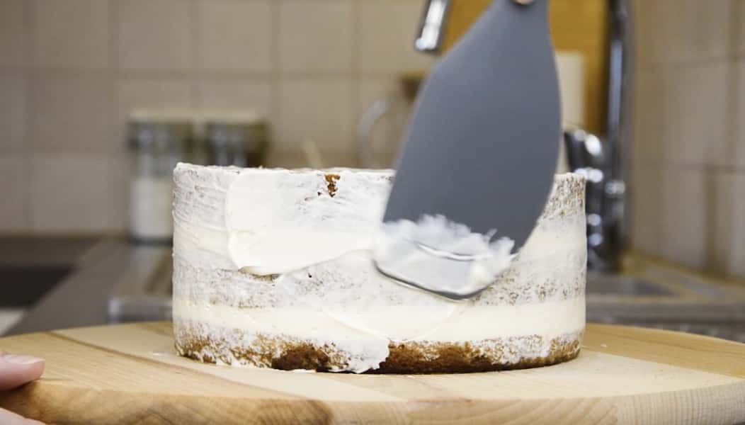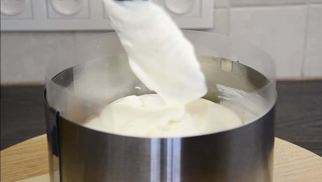 Останні пару ложок крему накриваємо і прибираємо в холодильник поки що, він нам знадобиться щоб обмазати боки торта.
