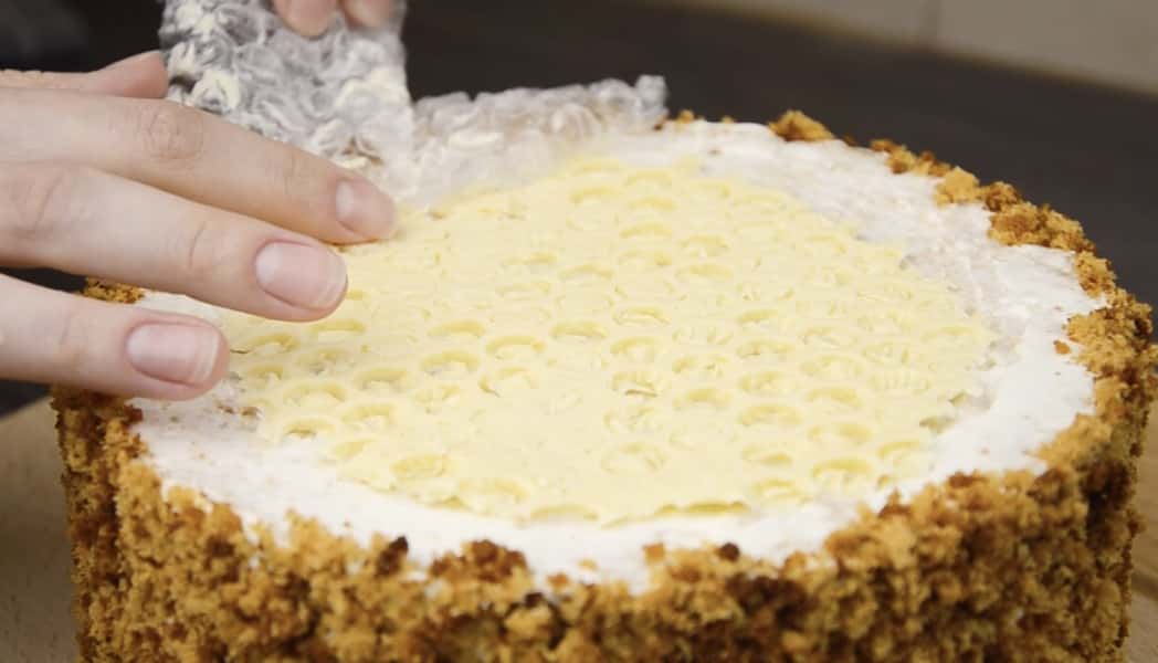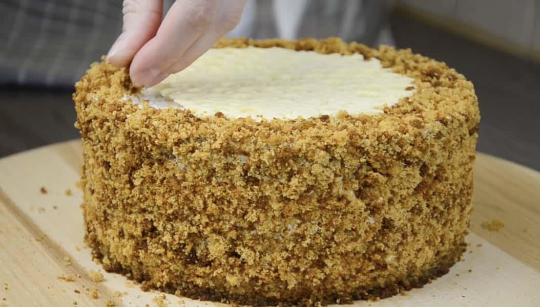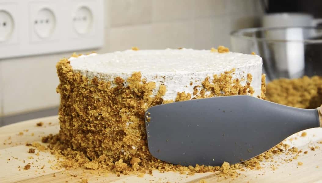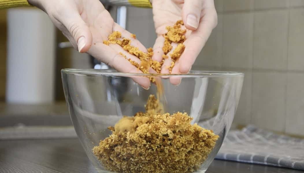 Якщо ви вирішили таки залишити торт у холодильник, тоді за цей час можна підготувати крихту. Ідеально буде скористатися чашею з ножем для блендера, але якщо у вас такої немає, тоді можна і просто руками розім’яти її.