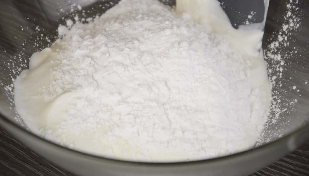 Тепер приготуємо крем. Для цього беремо 270 гр. холодної сметани, у мене вона 15%, і висипаємо до неї 60 г цукрової пудри і добре перемішуємо.