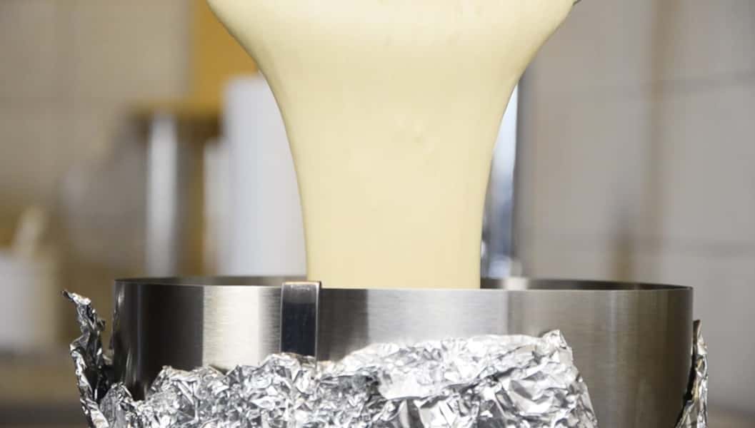 Я заздалегідь підготувала форму, у мене це роз’ємне кільце діаметром 18 см. низ обов’язково обернула двома шарами фольги. І переливаю до неї тісто.