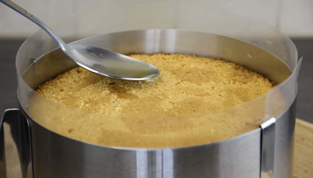 Залишилося тільки зібрати все докупи. Я для зручності збиратиму торт у кільці, а ви робіть як вам буде зручніше. На них кладемо корж, добре просочуємо його. Краще буде наносити просочення за допомогою пензлика, а то ложкою можна випадково перелити її і корж вийде занадто вологий.