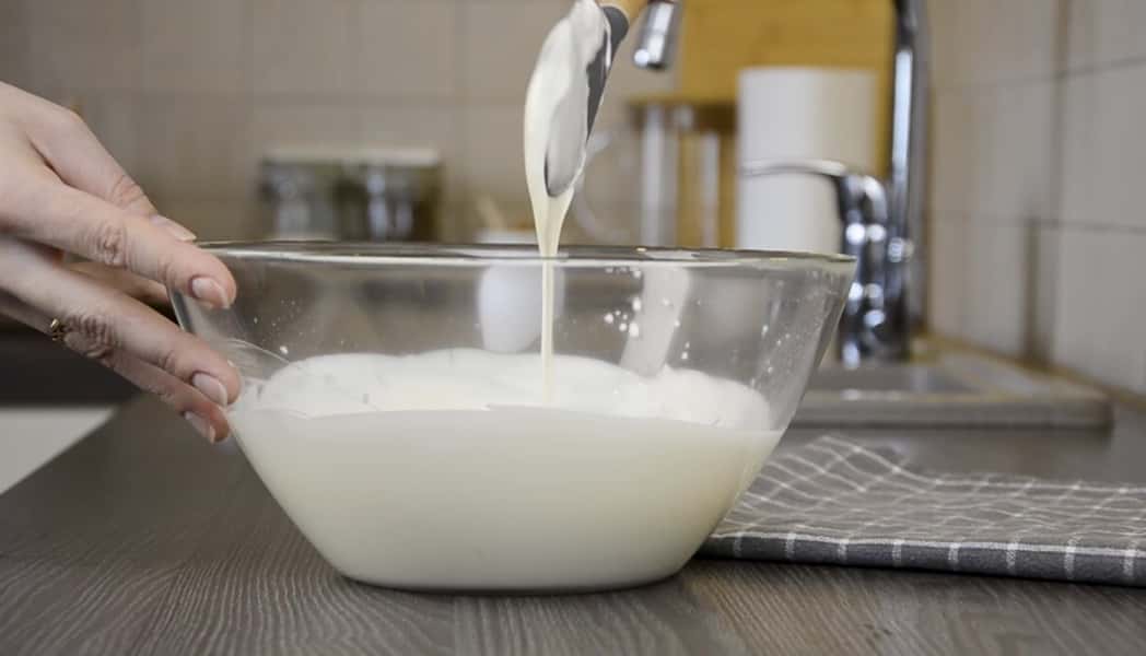 Потім вершки додаємо до сметани і ретельно лопаткою перемішуємо.