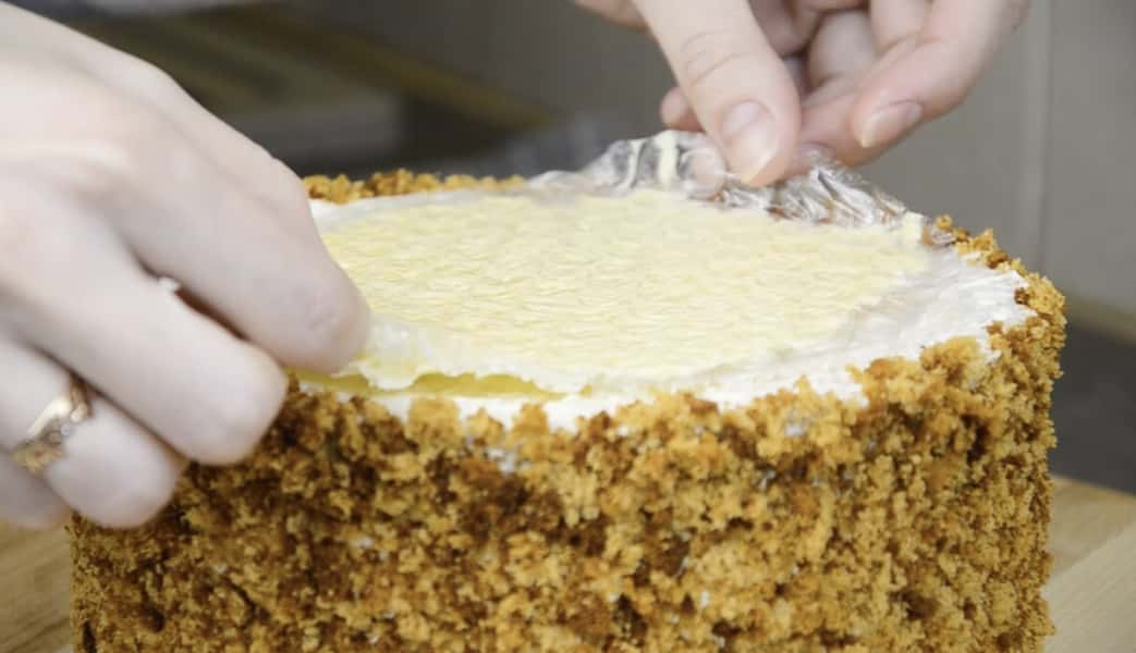 Сам торт я теж накриваю та прибираю в холодильник, щоб крем застиг і торт зафіксувався. Якщо ви чекати не хочете, тоді можете одразу змастити боки кремом та посипати крихтою.