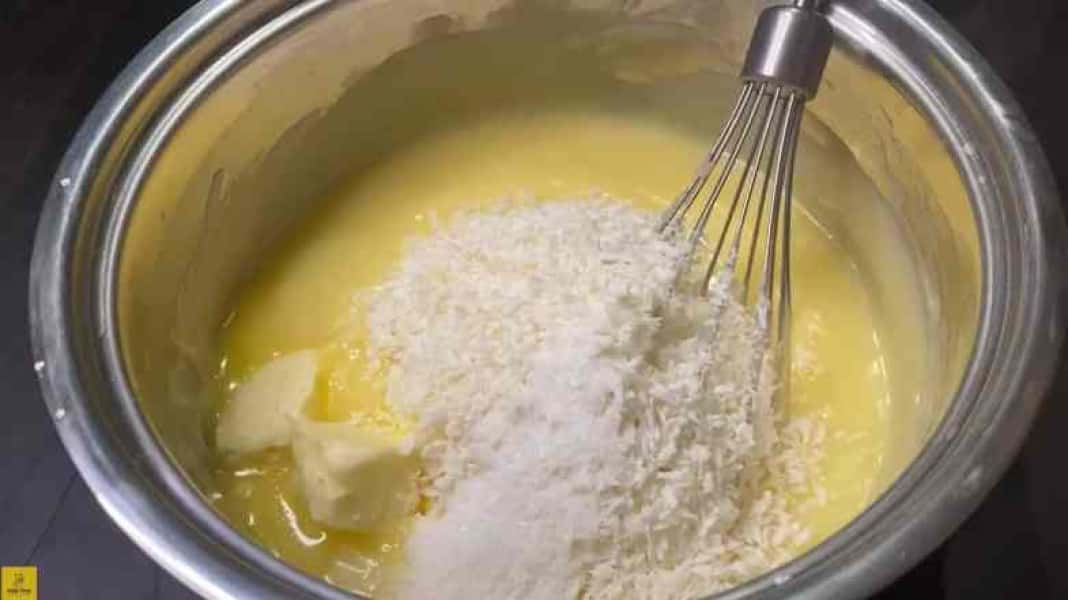 Додаю вершкове масло, кокосову стружку і ванільний цукор та добре перемішую до повного розчинення масла.