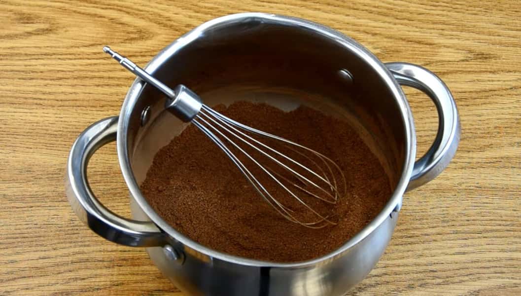 Спочатку потрібно в сотейнику або в каструльці змішати 115 г цукру і 25 г какао, їх потрібно добре перемішати до однорідності.