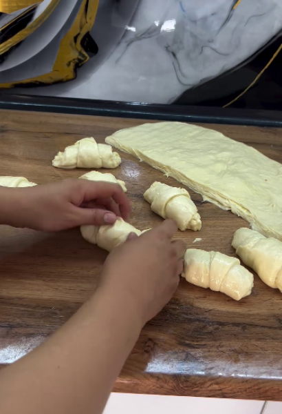 Розрізати на 6 смужок, кожну смужку розрізати навскіс, щоб вийшло два трикутники. На більшій частині трикутника зробити невеликий надріз і сформувати круасани. І тут робіть або з начинкою або ж пусті!