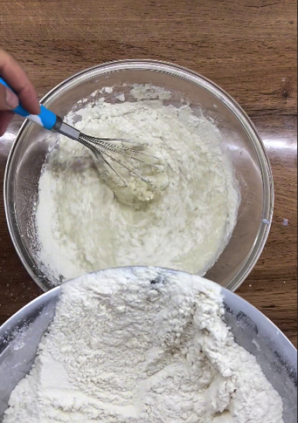 🟥Тісто: у мисці зʼєднати воду, молоко, додати дріжджі та вимішати до розчинення дріжджів.