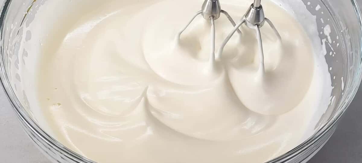 У сметану виливаємо вершки, цукрову пудру і змішуємо міксером.