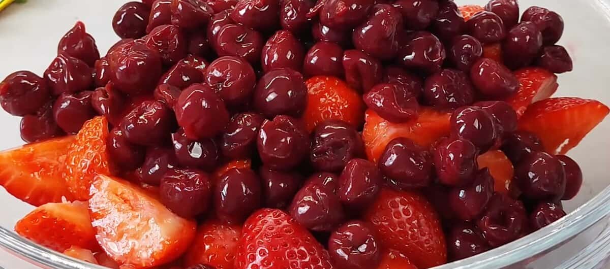 Полуницю нарізаємо маленькими кубиками і викладаємо до неї вишню.