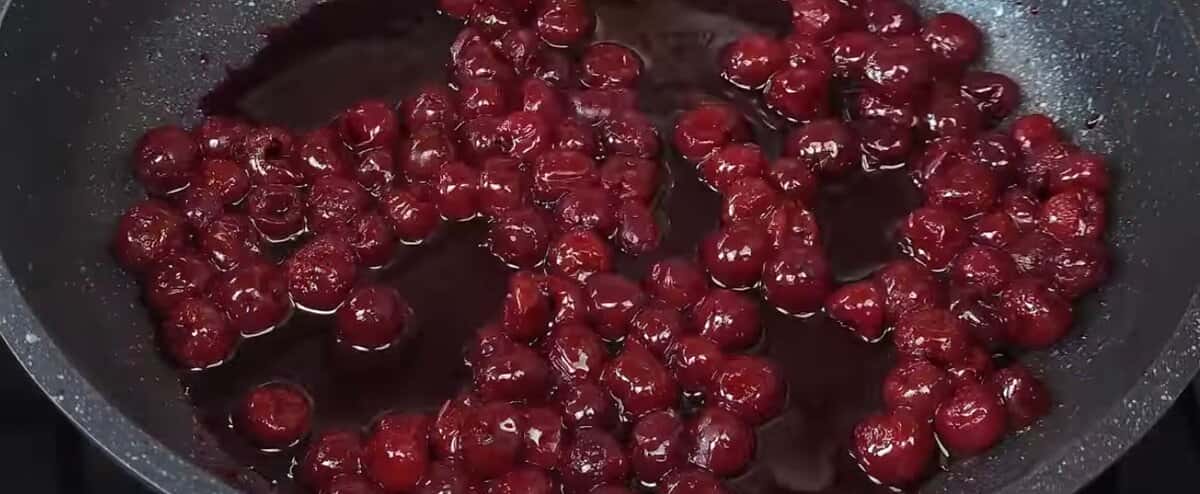 Вишню викладаємо на розігріту суху сковорідку, всипаємо цукор і готуємо до розплавлення цукру.