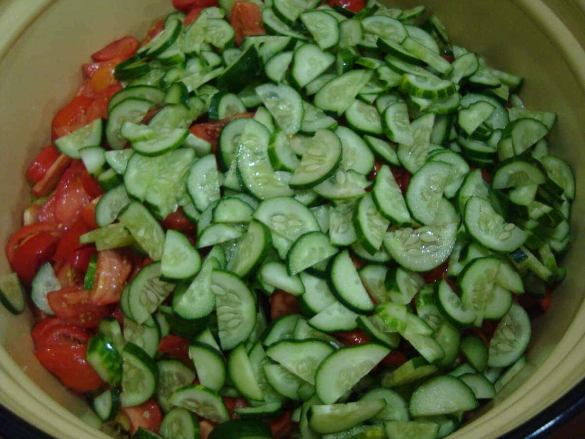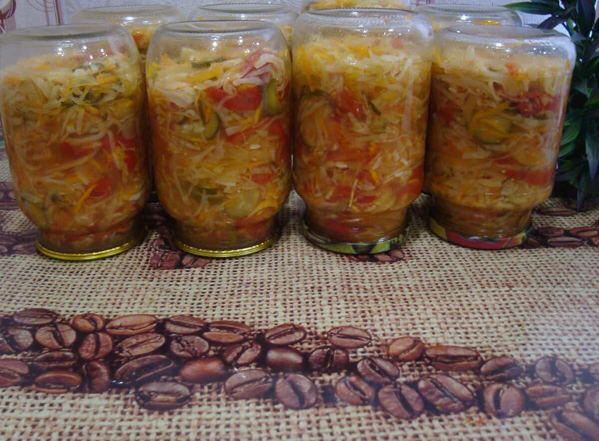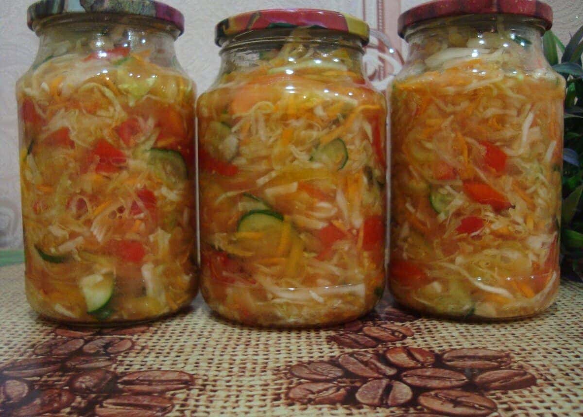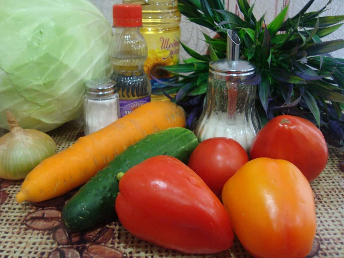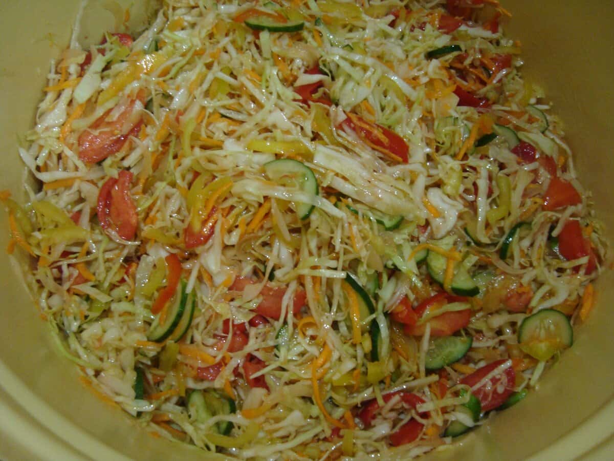 Сьогодні готую улюблений салат з капустою, болгарським перцем, помідорами і огірками. Сусідка по дачі поділилася рецептом салату, я взяла рецепт собі на озброєння, трохи змінивши під свій смак. Коли готую такий салат на зиму, їмо його в свіжому вигляді і консервую на зиму в банки, поповнюю свій підвал улюбленими заготовками. Виходить дуже смачним, красивим, апетитним з приємним ароматом. Відкриваю баночку салату, беру тарілку побільше, тому що з’їдаємо його миттю.