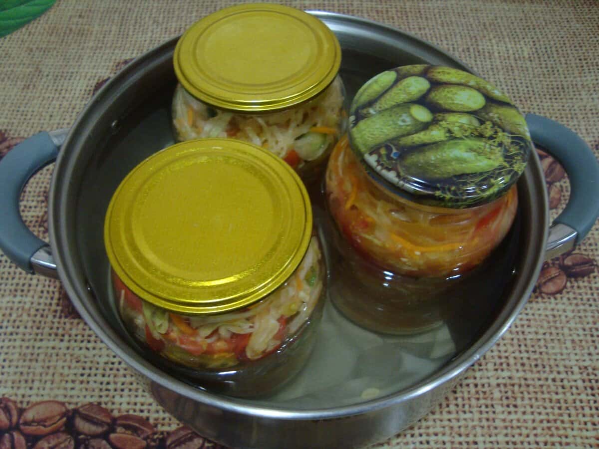 Салат розкладаю в стерилізовані банки. У широку каструлю поклала на дно серветку, налила води і поставила банки. Банки просто прикрила кришками. Каструлю з банками ставлю на вогонь. Після закипання стерилізують 30 хвилин.