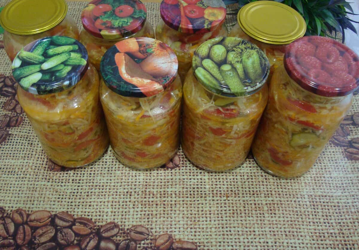 Дістаю банки, закручую кришками, перевертаю вниз горлечком. Укутую і залишаю до повного охолодження. Зберігаю в підвалі. Ось такий гарний, яскравий, барвистий і дуже смачний виходить салат.