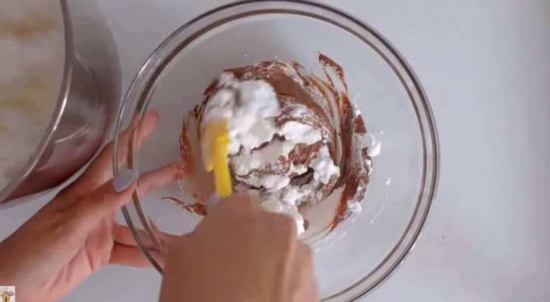 У кілька прийомів з’єдную білки з шоколадною масою. Роблю це максимально акуратно, щоби білки занадто не опали і тісто залишилося пишним.