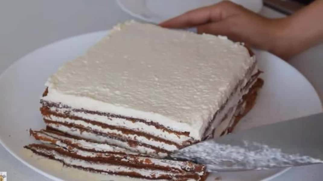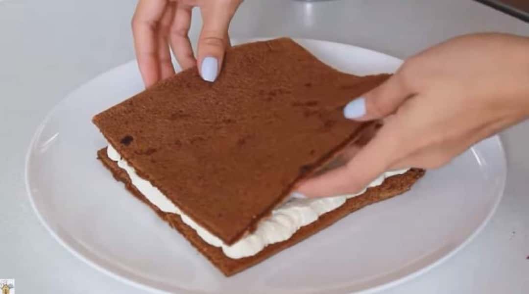 Боки промазувати не буду, тільки верх. Рівняю ножем краї. Відправляю торт у холодильник на годину.