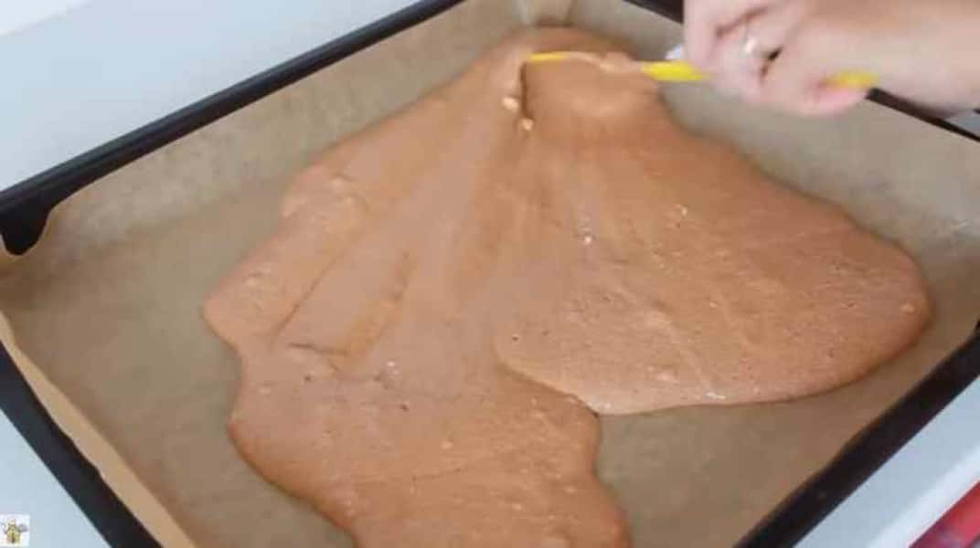 Деко застилаю папером для випічки і викладаю масу для коржа на папір. Духовку розігріваю до 180 ° C і випікаю корж 15 хвилин.