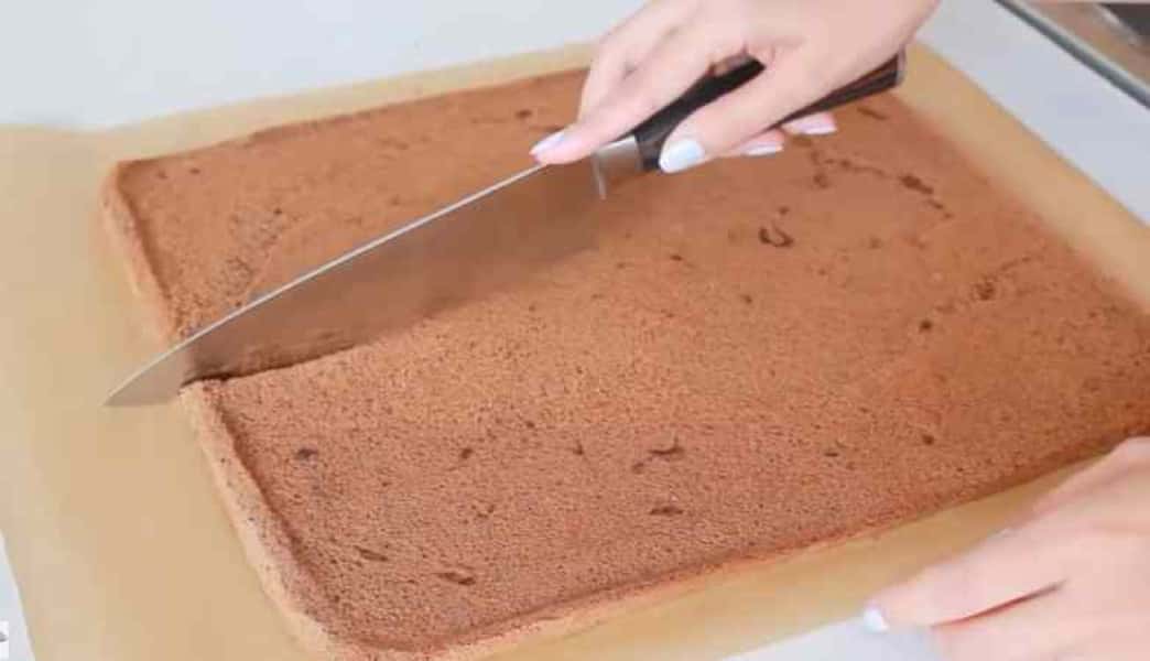 Після духовки залишаю корж, щоб трохи охолонув і акуратно знімаю пергаментний папір. Потім розрізаю корж на 4 рівні частини.