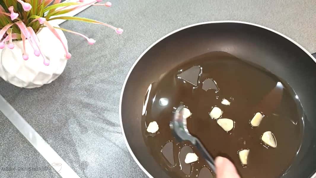Забираю сковороду на плиту, нехай часник обсмажиться в олії до золотистого кольору, він олії віддасть весь аромат. Часник потім викинемо.