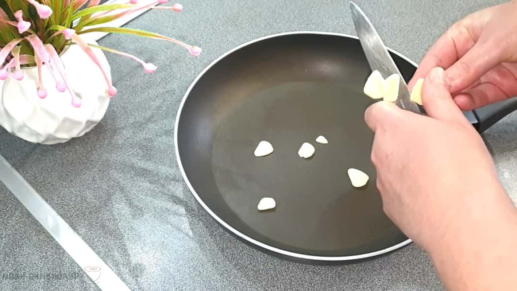 Починаю з підготовки ароматної олії. У сковороду нарізаю 1 зубчик часнику