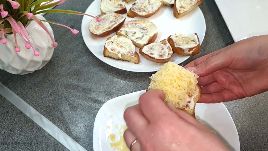 Бутерброди потрібно трохи остудити і тепер намазую з одного боку кожен шматочок сумішшю майонезу і часнику