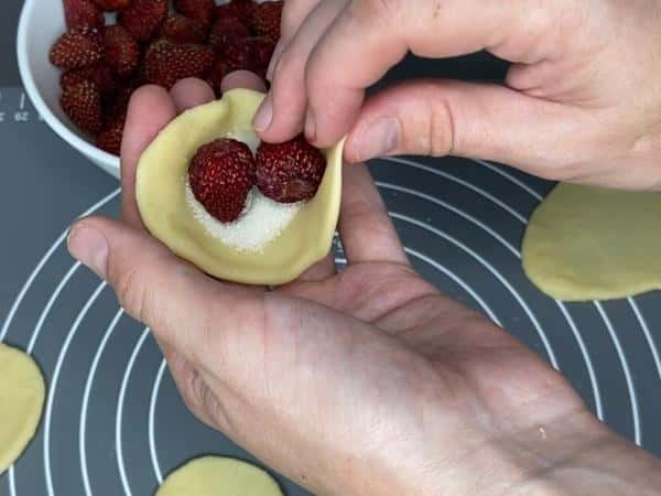 Полуничка у мене кислувата, тому додаю крапельку цукру. Далі укладаю полуничку і формую вареник.