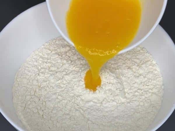 Далі вливаю яйце в борошно, злегка перемішую. Борошна я беру 3 склянки, приблизно 450 г.