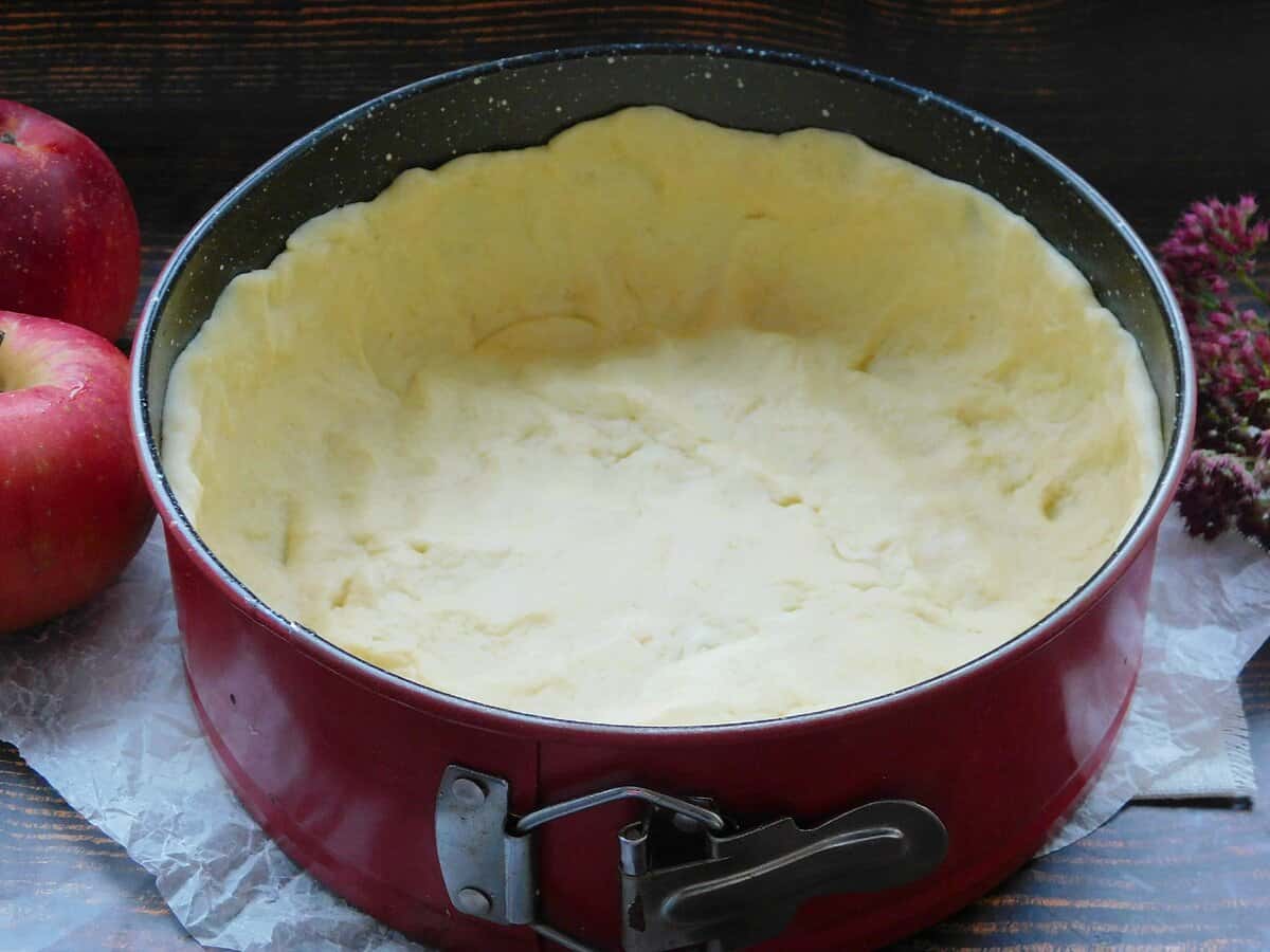 6. Охолоджене тісто руками розподілити по дну і стінок форми тонким рівномірним шаром. Тут діаметр 20 сантиметрів.
