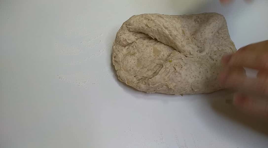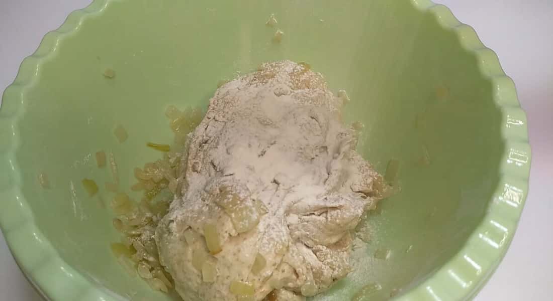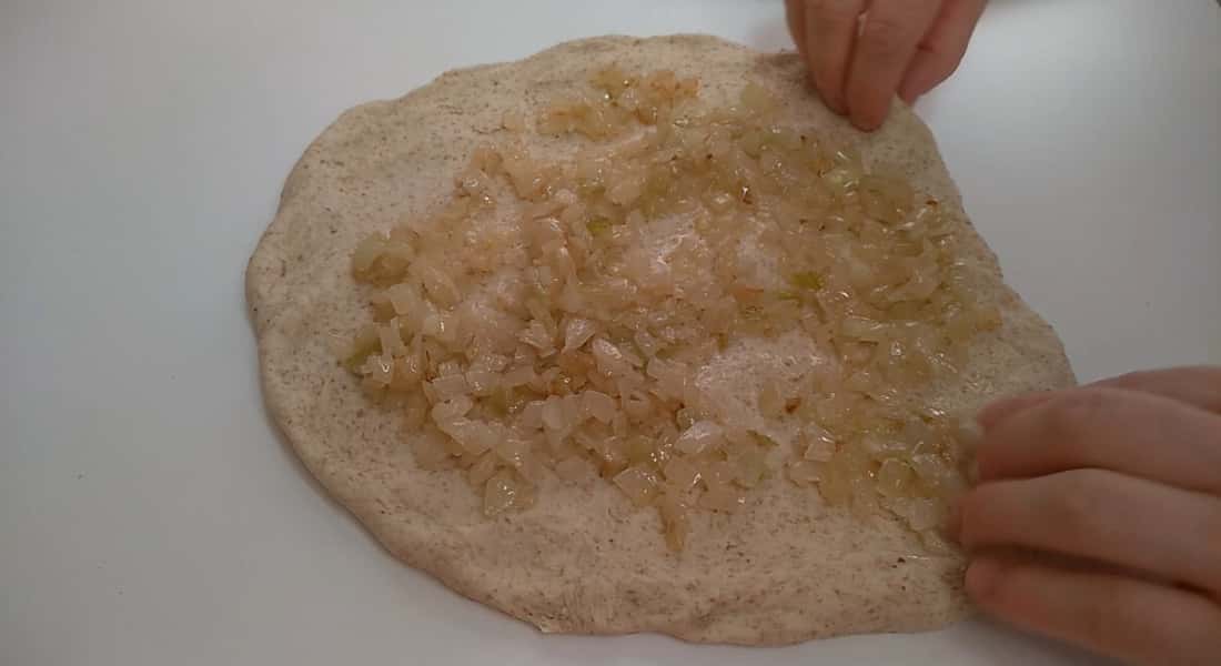 Тісто відпочило стало трохи м’якше. Руками розтягуємо тісто в пласт на середину викладаємо дрібним кубиком нарізану і обсмажену на олії до легкої золотники цибулю, розрівнюємо по тісту. Згортаємо тісто в конверт, перекладаємо в миску, трохи присипаємо борошном і вмішуємо цибулю в тісто.