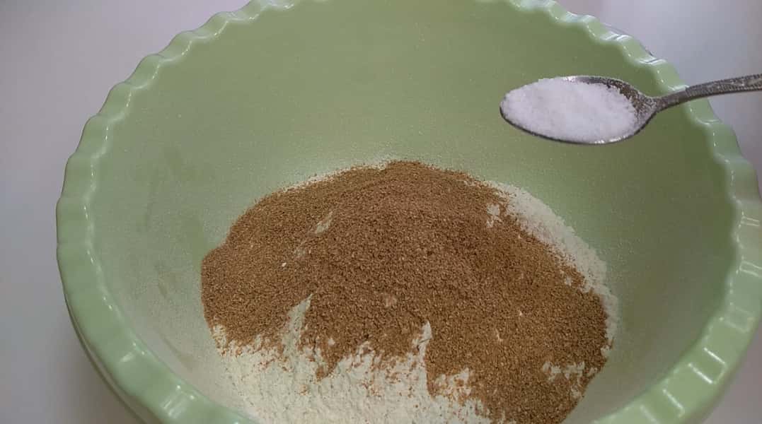 У миску просіюємо 380 г борошна вищого ґатунку, додаємо 20 г пшеничних висівок, 1 ч л солі , розмішуємо всі сухі інгредієнти.