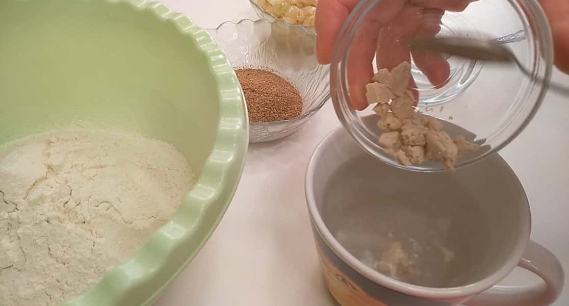 У чашу наливаємо 250 мл теплої води 36-38 градусів і відправляємо туди 8-9 г живих дріжджів, розмішаємо, щоб дріжджі розчинилися.