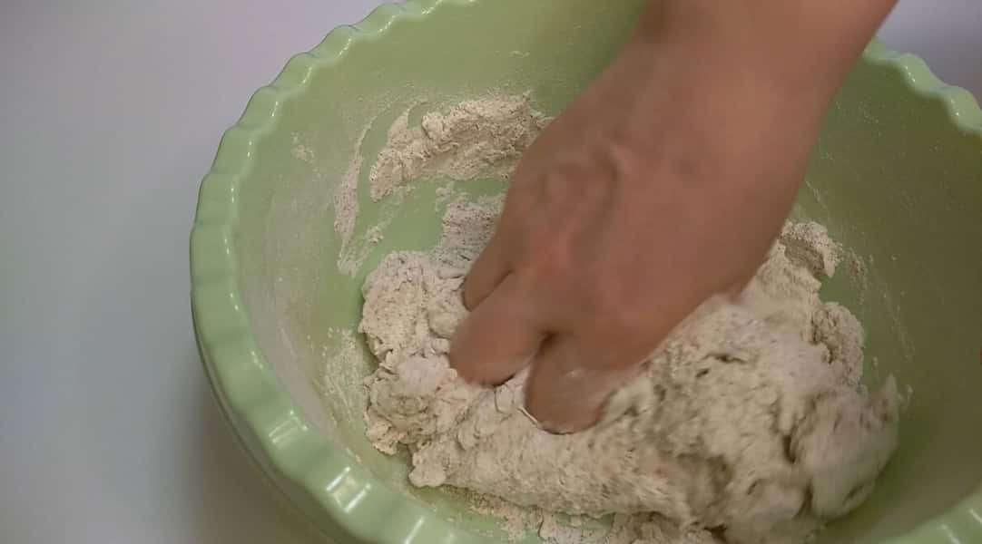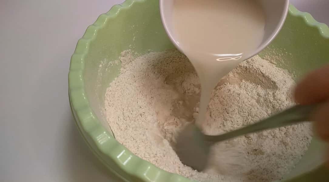 У борошняну суміш вливаємо дріжджі, замішуємо тісто.