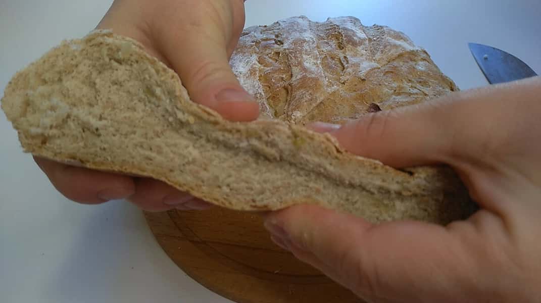 Хліб добре пропікся, зверху хрумка скоринка, дрібно пористий і злегка вологий усередині. Від шматочка такого хліба всі будуть ситі.