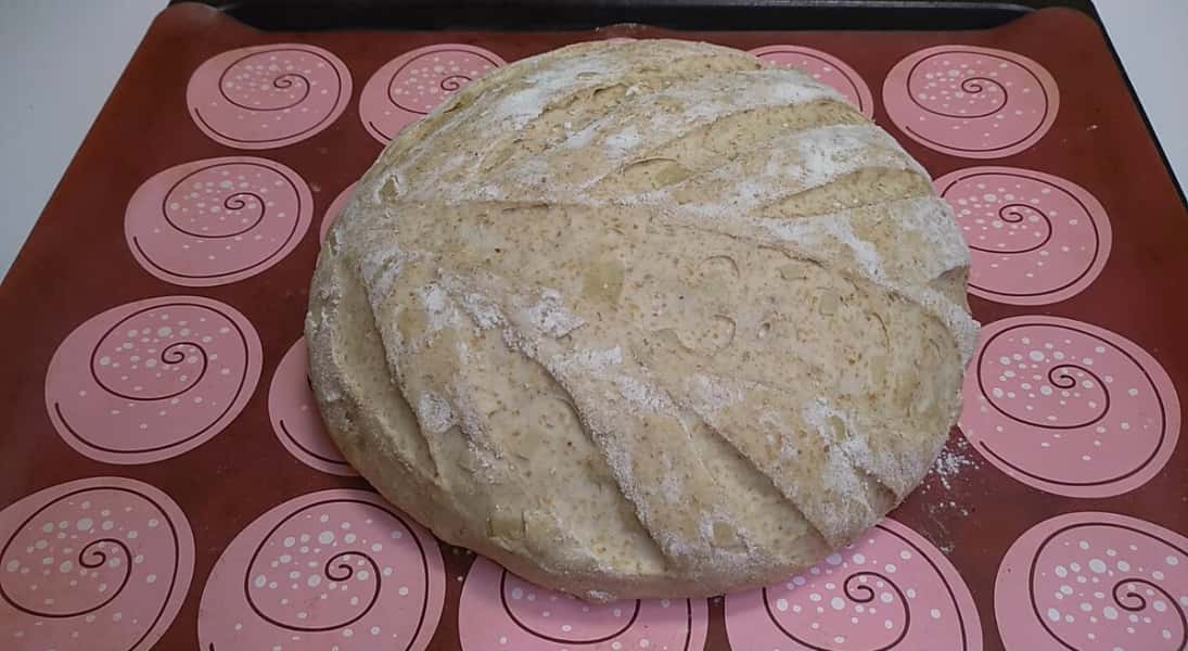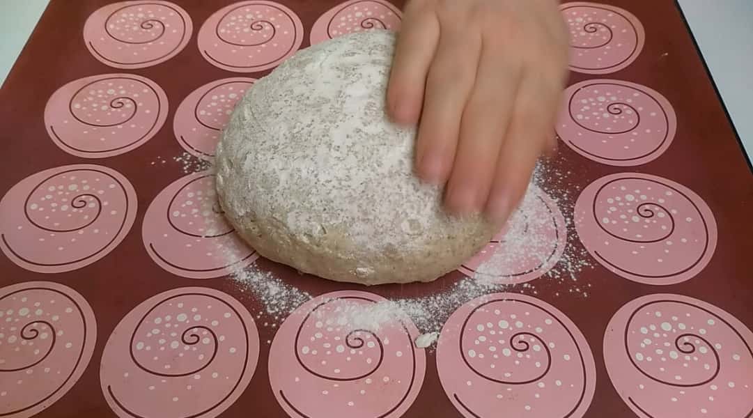 Сформований хліб кладемо на лист, посипаємо борошном, долонею проходимося по хлібу, ніби злегка втираючи борошно.
