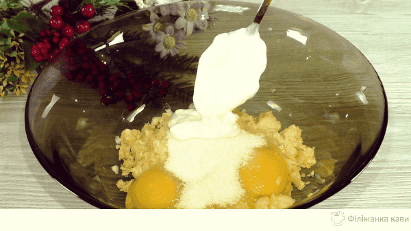 Додати цукор, його кількість залежить від того, з чим будете подавати оладки. Якщо з солодким соусом, джемом, медом – то 1 ст. л. буде досить.