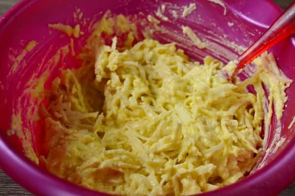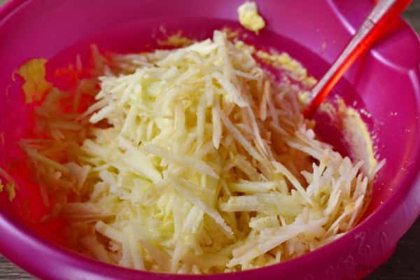 Додаємо натерті яблука в сирне тісто і перемішуємо.