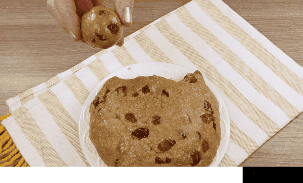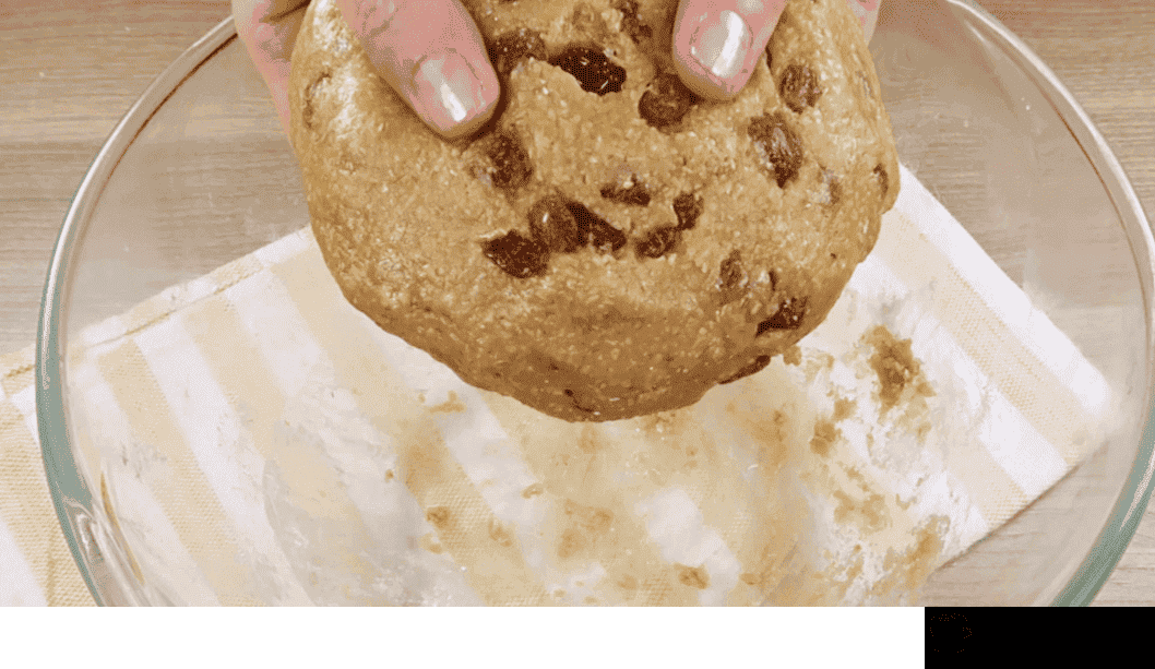 - Як тільки суміш стає густішою, висипаю борошно, що залишилося і вимішую тісто руками. Висипаю в тісто родзинки і ще трохи перемішую. Тісто виходить досить м’яке та слухняне.