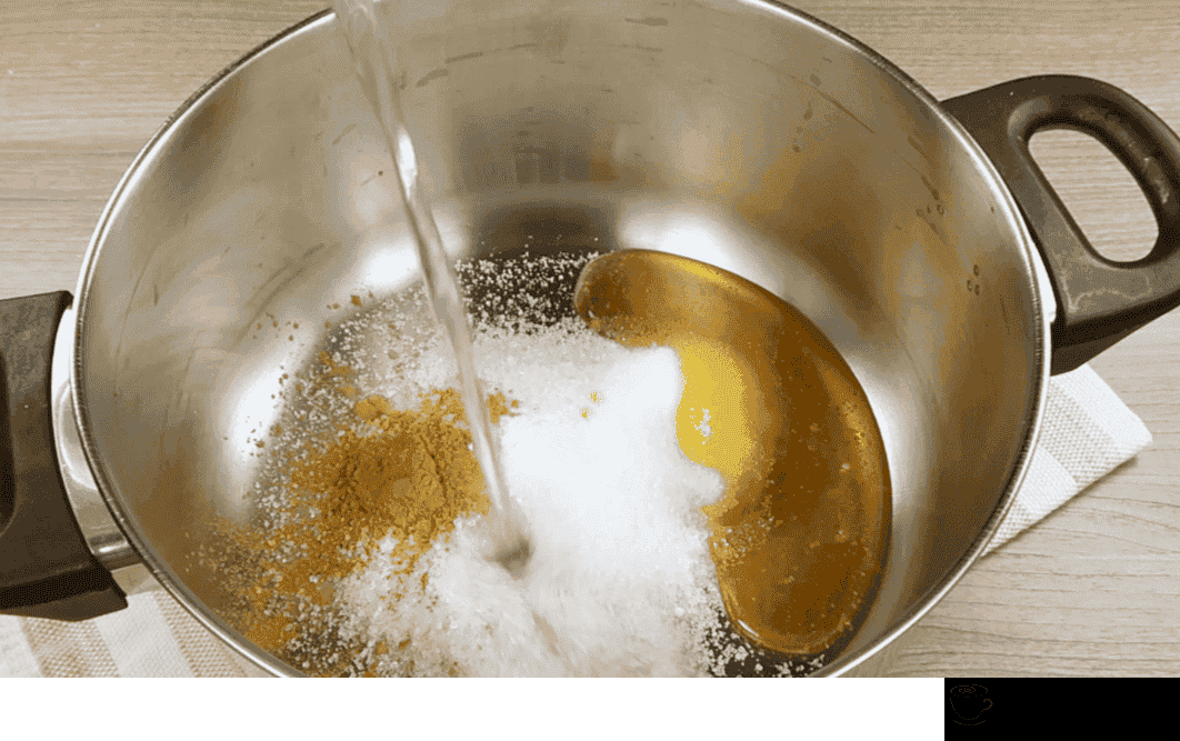 - У каструлю висипаю цукор, додаю ванільний цукор, дрібку солі, корицю та мед. Виливаю воду та ставлю продукти нагріватися.