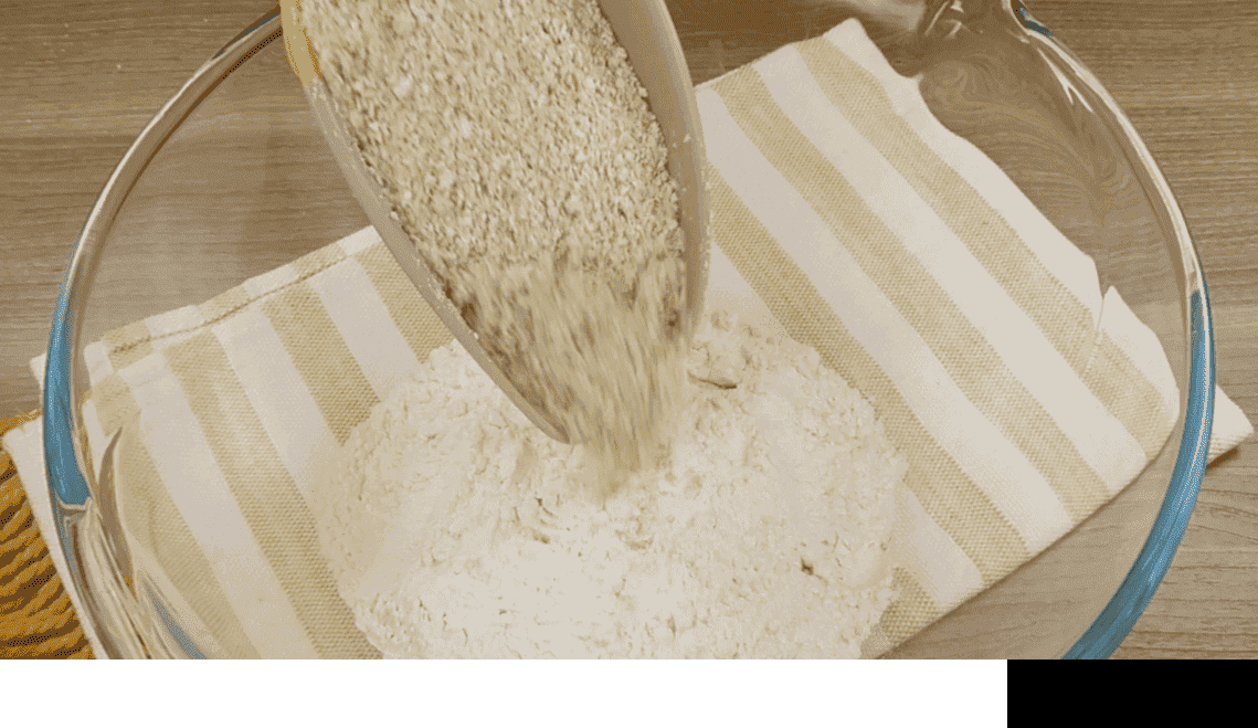 - У тарілку для змішування просіюю борошно, додаю подрібнені пластівці, перемішую продукти вінчиком.