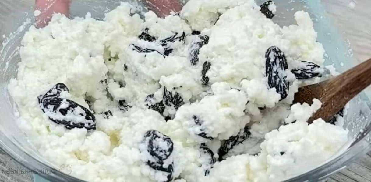 До сиру додаємо яєчний білок, цукор, ванільний цукор, родзинки і розмішуємо.