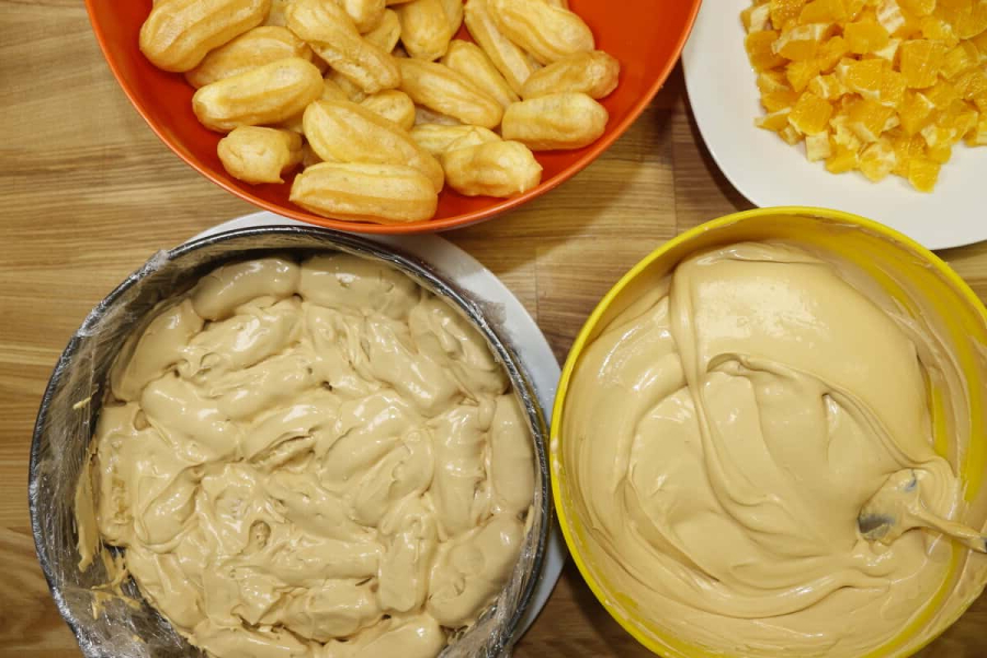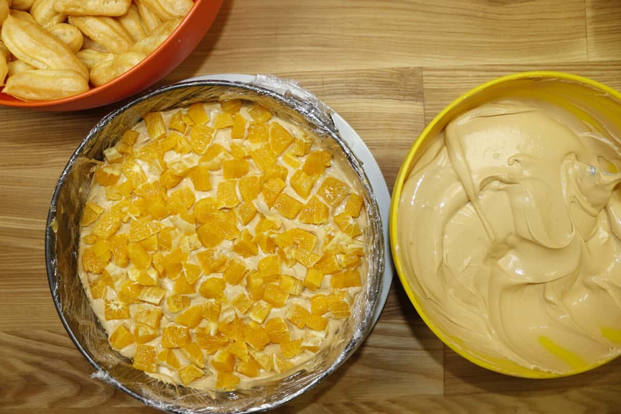 Після того, як перший ряд заповнений, зверху тістечка теж злегка промазують кремом. Наступний шар — нарізані апельсини, які покриваю кремом.