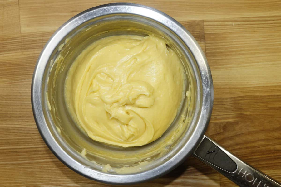 Знімаю сотейник з вогню, і залишаю тісто для охолодження на кілька хвилин. Далі в тісто вбиваю по одному яйцю і перемішую його до однорідності. Тісто не повинно вийти сильно густим. Якщо тісто виходить густе, тоді необхідно додати ще одне яйце.