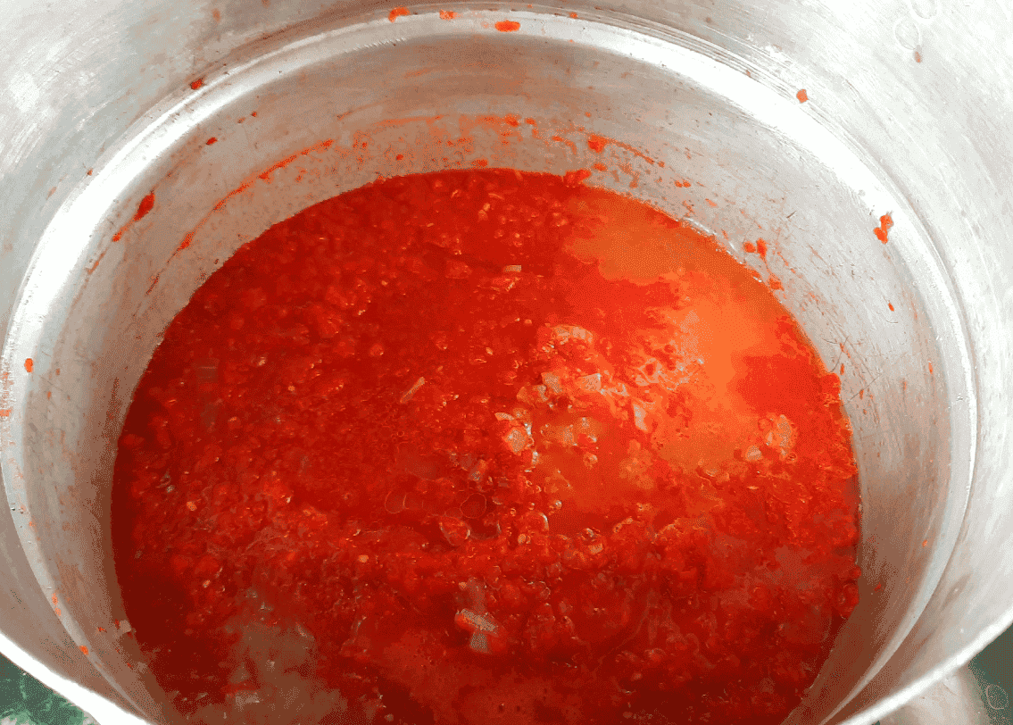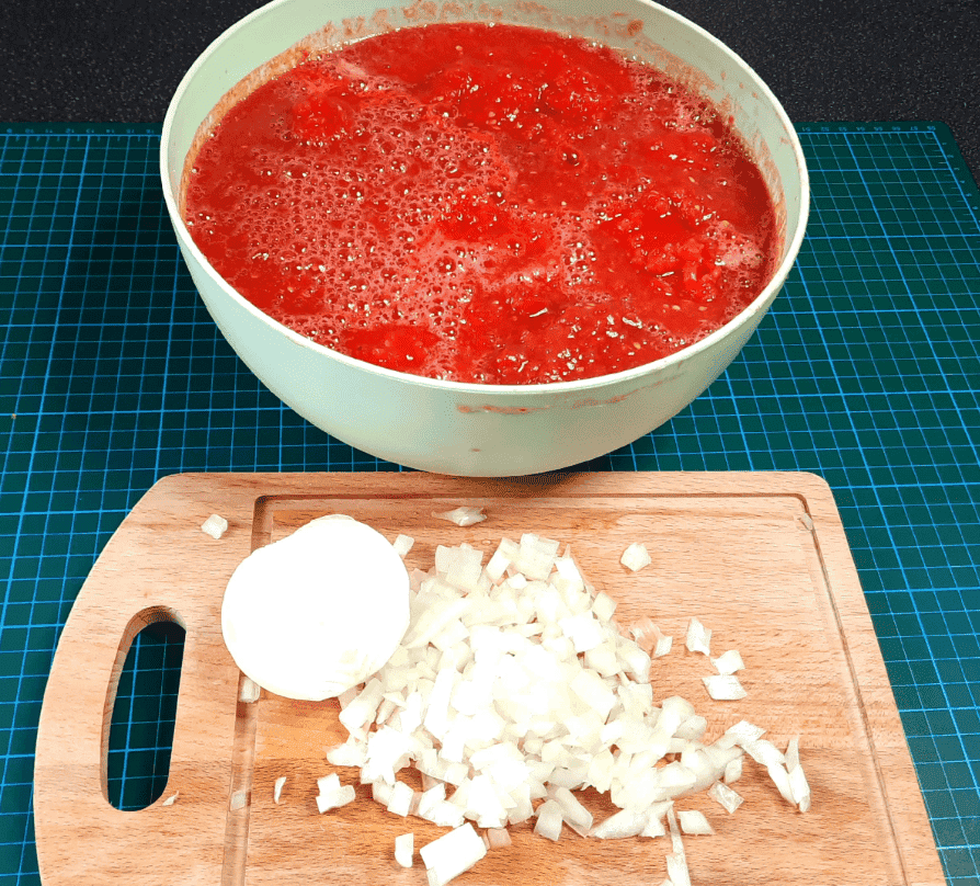 Далі помідори та перець пропускаю через м’ясорубку або подрібнюйте зручним для вас методом. Цибулю нарізаю дуже дрібно.