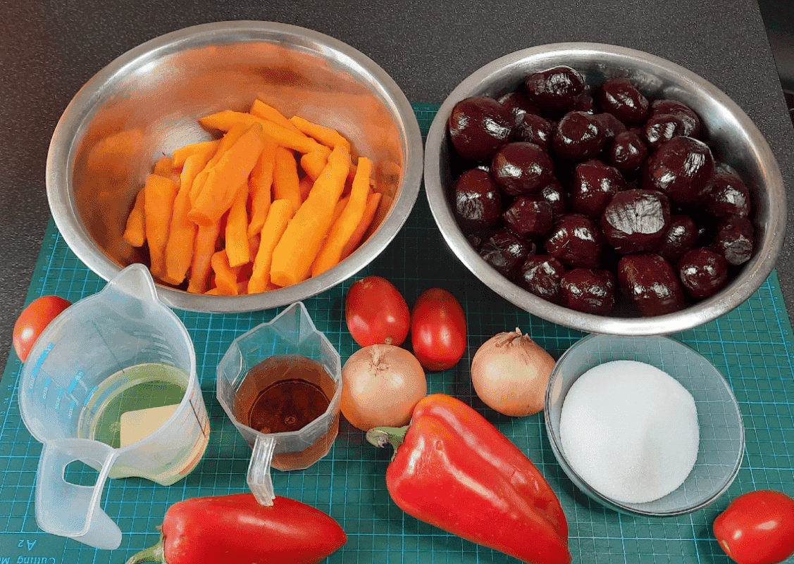 Нам буде потрібно: буряк, морква, цибуля, помідори, солодкий перець, олія, яблучний оцет, сіль, цукор.