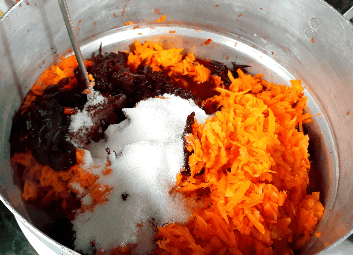 Далі кладу тертий буряк, моркву, цукор, сіль та яблучний оцет, добре промішую. Після закипання варю 10 хвилин і далі укладаю в стерилізовані банки, закручую кришками. Перевертаю, накриваю ковдрою та залишаю до ранку.