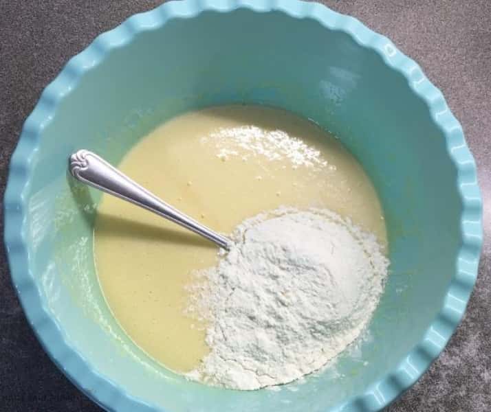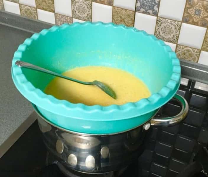 Через п’ять хвилин додаємо 0,5 склянки борошна від загальної кількості і знову ставимо на парову баню на п’ять хвилин, постійно помішуючи.