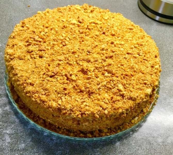 Обрізки від коржів подрібнюємо за допомогою скалки або блендера і прикрашаємо тортик зверху. Ось такий красень у нас вийшов.