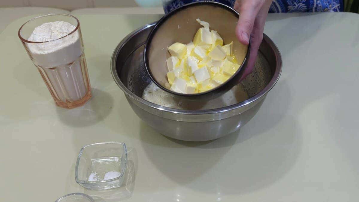 Додаємо інші інгредієнти і борошно. Замішуємо тісто.