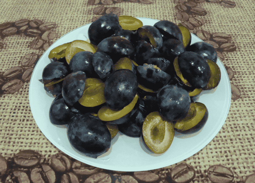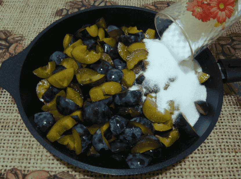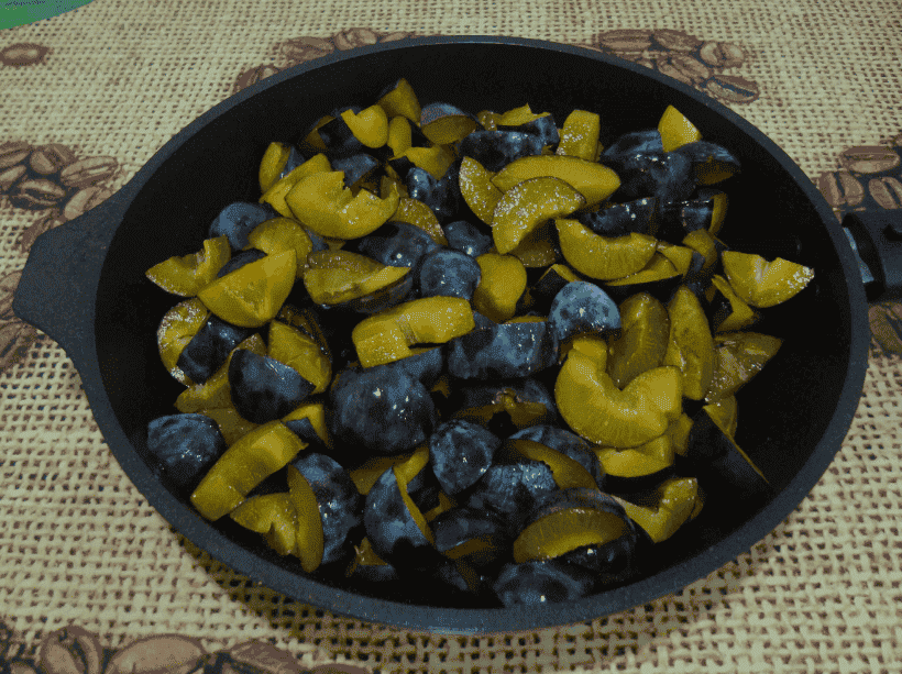 Нарізаю шматочками, викладаю сливи у сковороду.